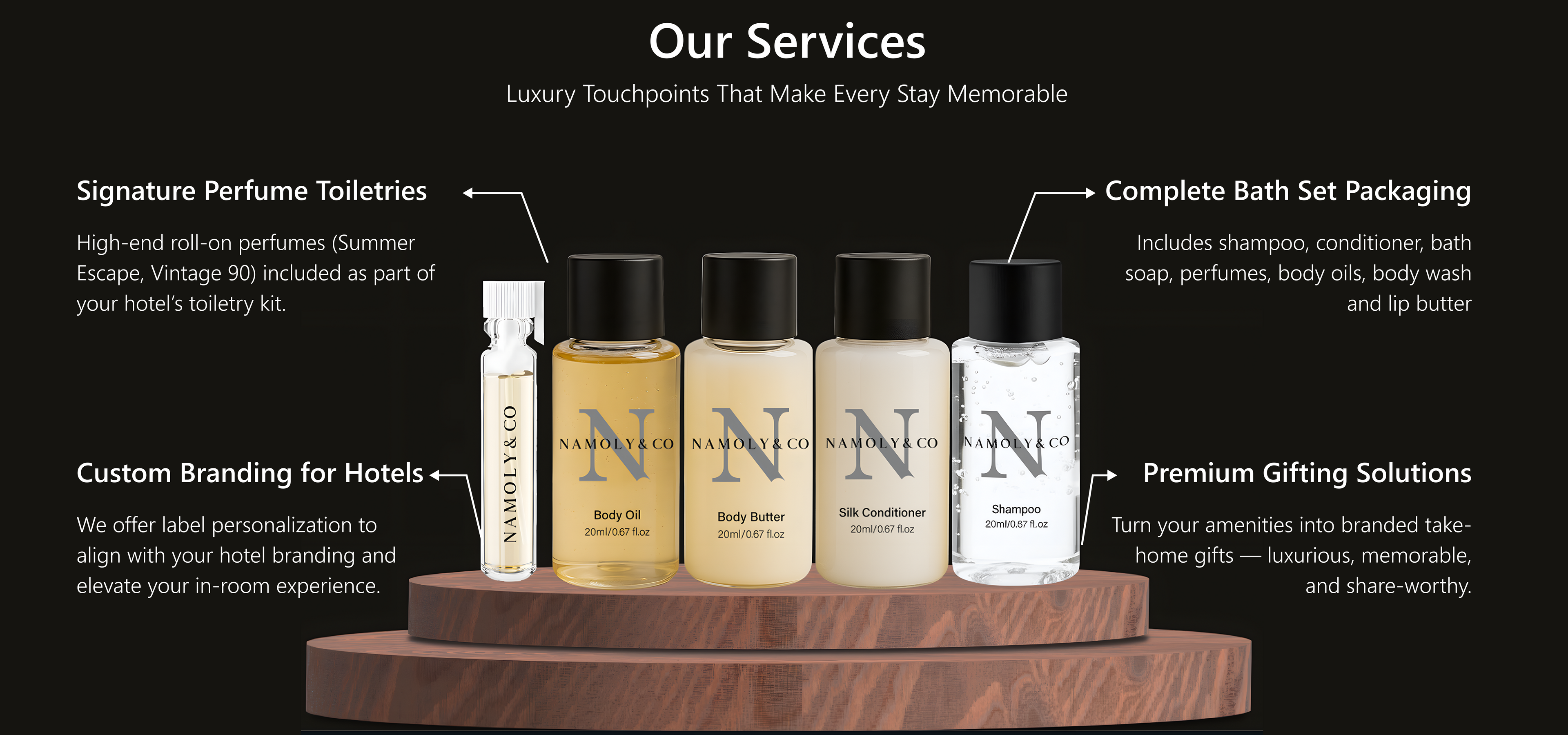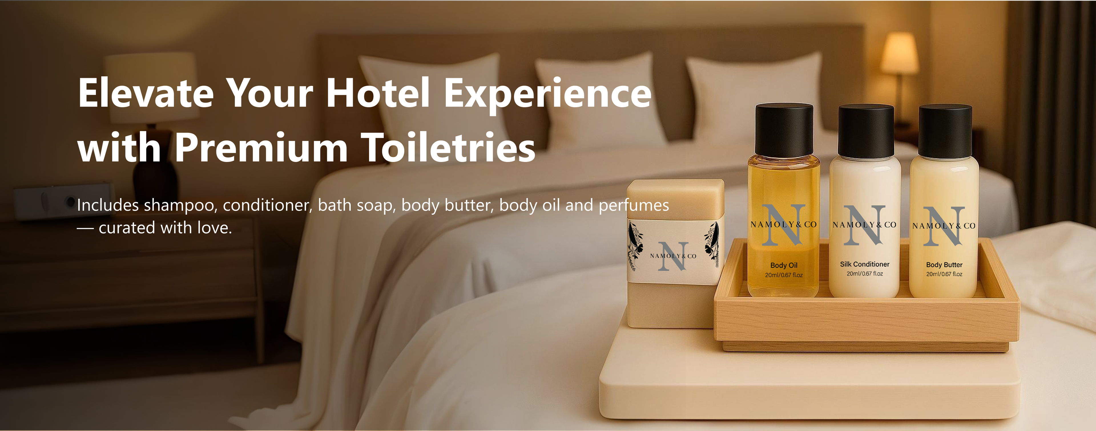 At Namoly & Co., we believe the guest experience begins with the smallest details. Our Hotel Kits are crafted to turn everyday routines into moments of indulgence — from the first drop of shampoo to the last lingering note of fragrance.